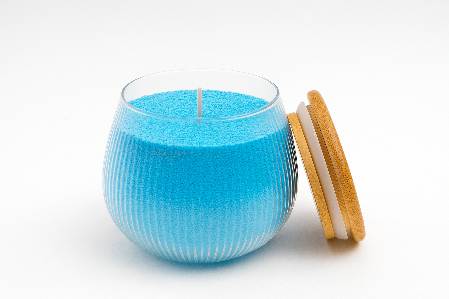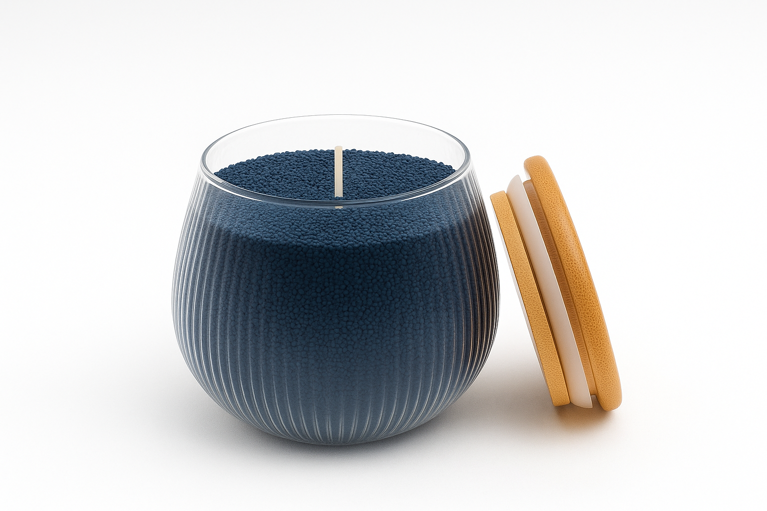 Clean-burning, vibrant blue granular wax in a stylish ribbed glass jar with a natural bamboo lid. The reusable, no-mess alternative to traditional candles.