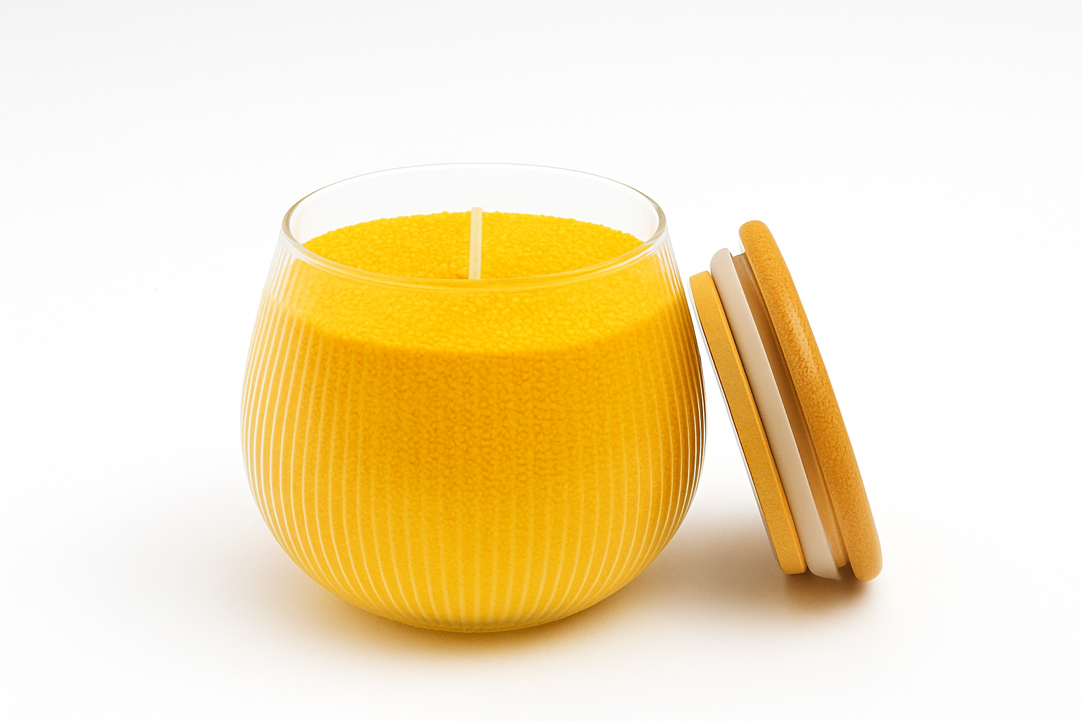 • Distinctive Glass Vessel: The candle is housed in a beautifully rounded, ribbed glass jar with an elegant “hourglass” silhouette. The textured vertical ribbing creates a captivating visual effect, enhancing the light from the flame.